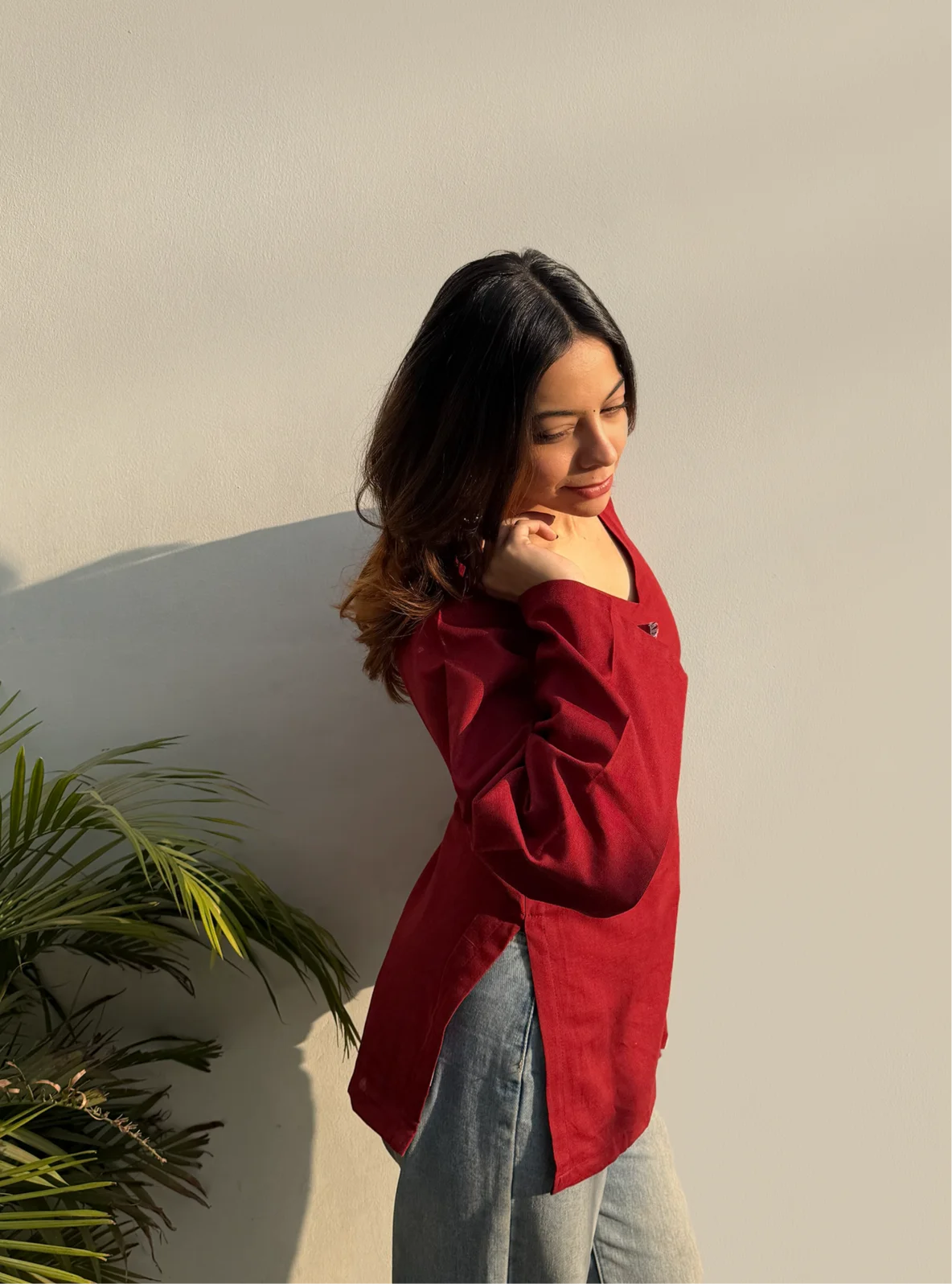 Bulbul Red Bell Sleeves Kurti by Evara features a clean silhouette, comfortable fit & a cotton–linen blend fabric—perfect for college, office and everyday wear.