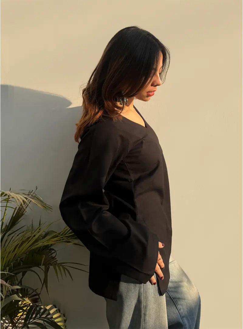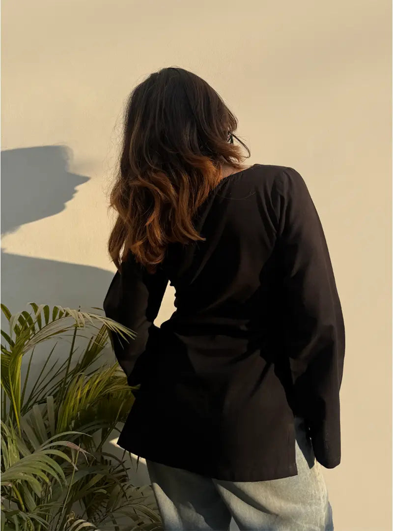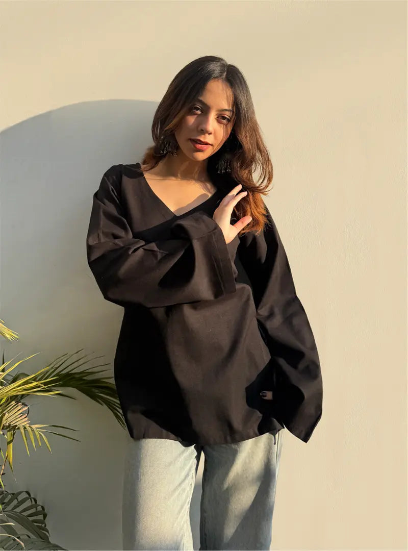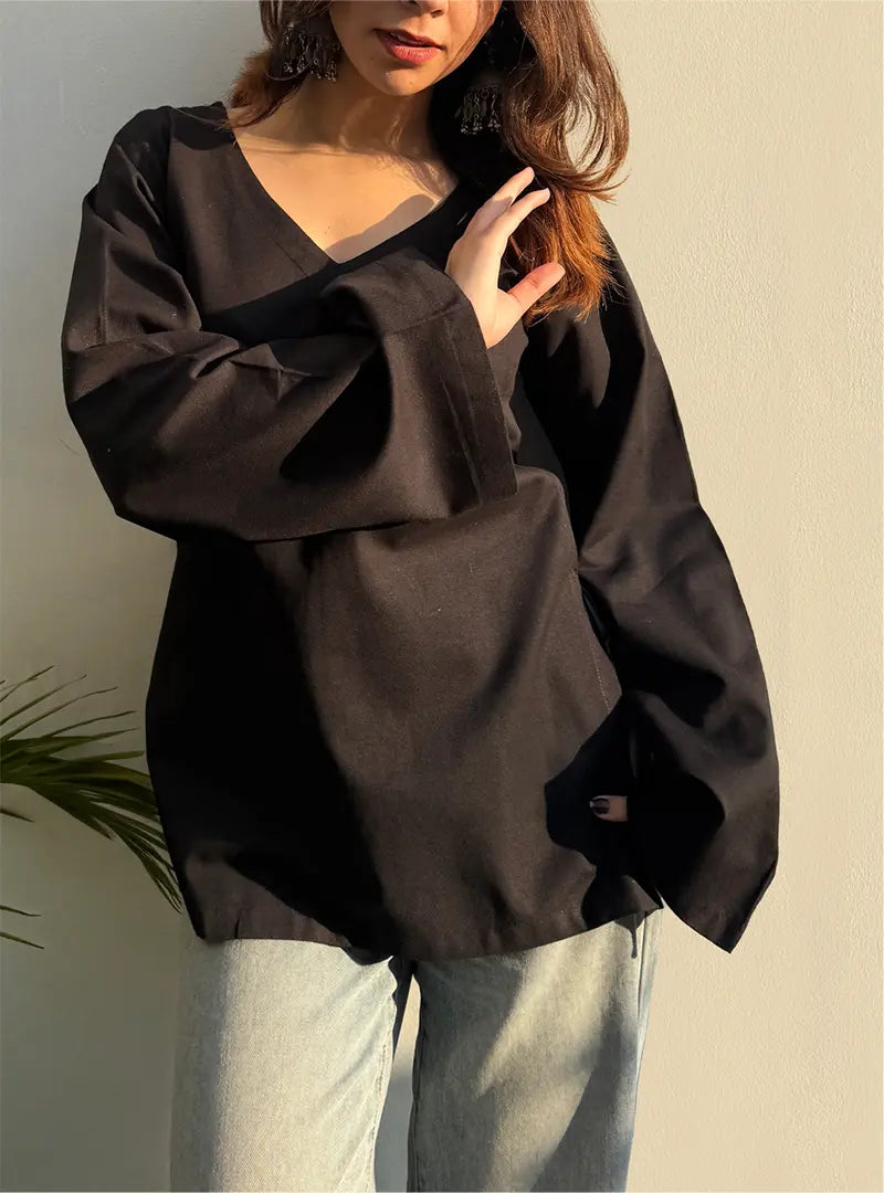 Koyal Black Bell Sleeves Kurti by Evara features a clean silhouette, comfortable fit & a cotton–linen blend fabric—perfect for college, office and everyday wear.